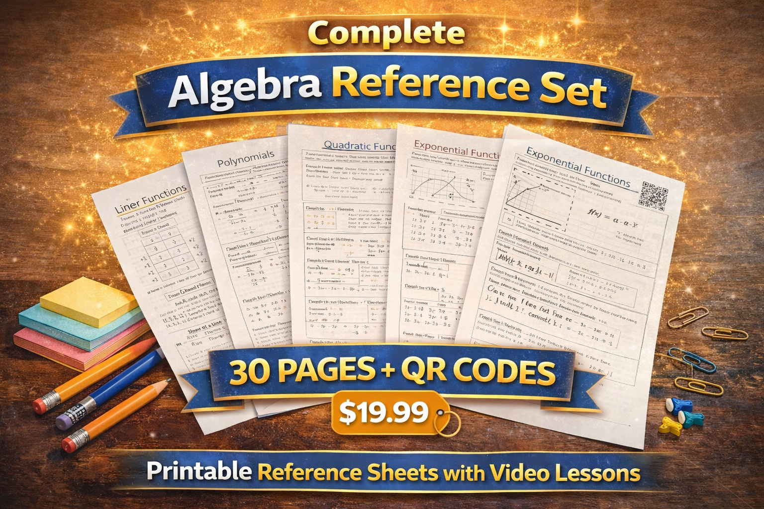 • 30 pages of clear explanations of key algebra concepts • Fully worked example problems • Important algebra rules and formulas • QR codes linking to Peachpi Math video lessons • Printable reference pages students can use while studying These guides work well for reviewing concepts, checking formulas, and seeing exactly how algebra problems are solved step by step.